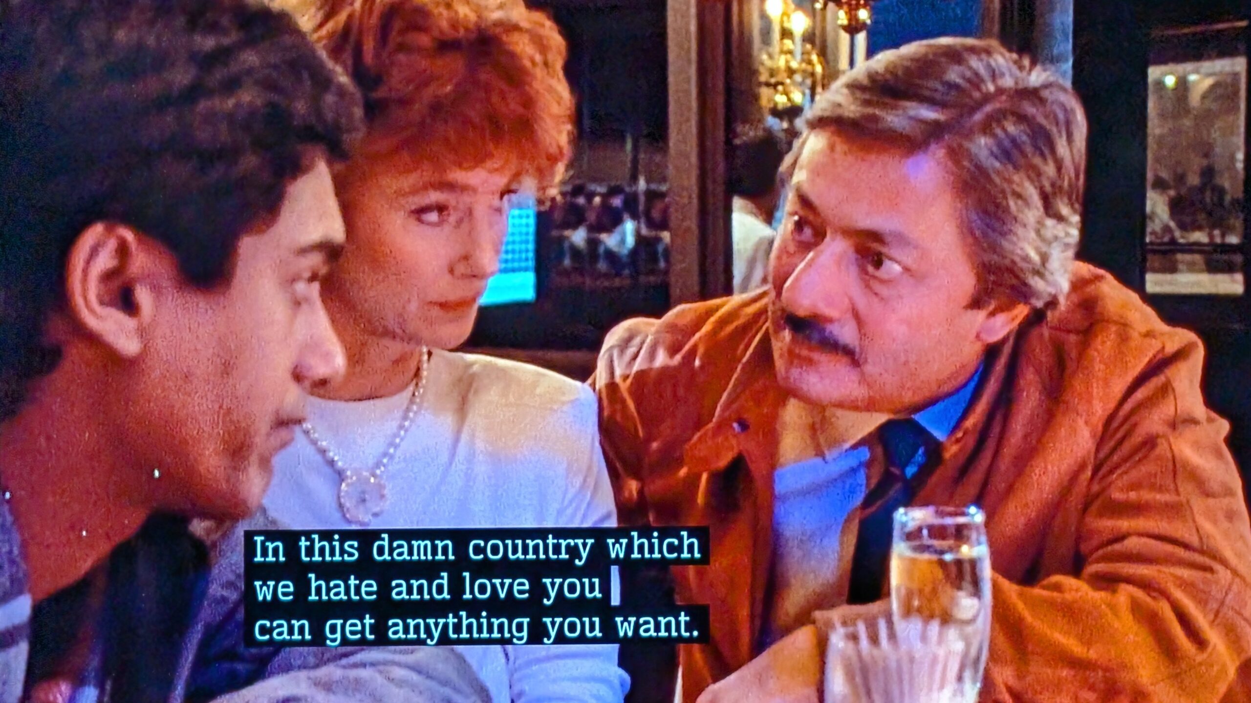 Young people. Pakistani Brits, the children of immigrants. London in the 80s. Hustle Culture. The Tube constantly trundling past the flat. Racist Thugs. The sickly father who, like Charlie Bucket’s grandparents, won’t get out of bed, played by Roshan Seth, feels comfortably familiar, because you recognize him from half a dozen other movies. The protagonist starts working for a successful Uncle and takes over running a funky little laundromat, which he fixes up nice. Hijinx ensue as secrets are revealed. A fun movie.