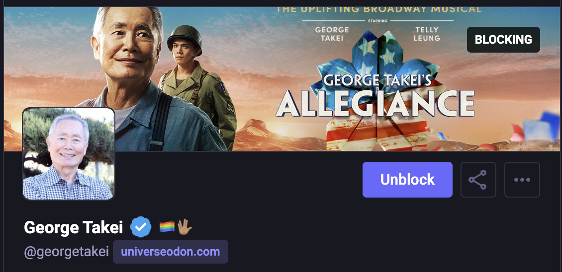 That left me with one last grouse I have had about Mastodon: the one thing I can not easily block is re-toots of screenshots of X. Or can I? Well, I think I effectively can. The secret is that stuff is mostly re-toots of George Takei, so blocking George Takei ought to do the trick.