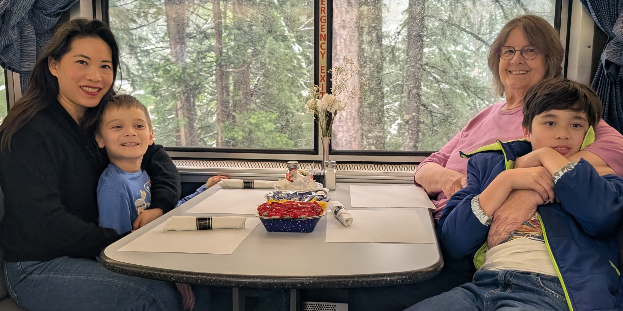 The attendant folded the seats in our cabin into bunks. The First Class Bedrooms shoehorn in a toilet room that also serves as a snug shower stall. When the lower bunk is extended, you enter the room by shuffling past the mattress, which mostly blocks the narrow doorway. Five of us and four bunks, with the bottom bunks I would describe as “twin and a half.” The boys were nervous about the top bunks, but Older Son took the one above Grandma. Mom took the top bunk above the one I shared with Younger Son. The night was comfortable enough. Quiet. Warmer than I like. The train rocked pleasantly. When he woke in the morning, Younger Son looked up out the window at the scrubby hills of Eastern Utah and said it was pretty.