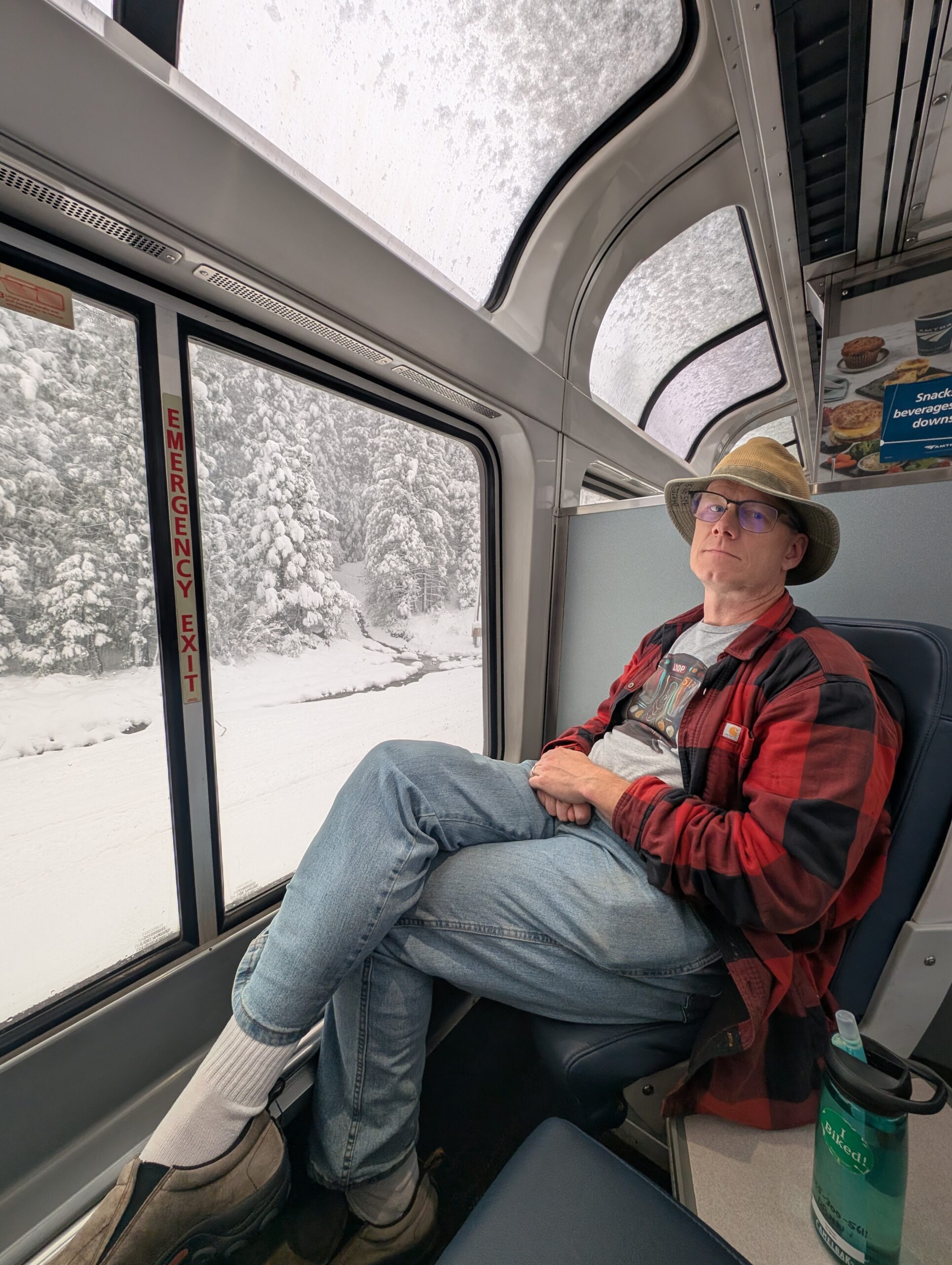 There were a decent number of folks riding to Reno, a favorite gambling spot for some Californians. A lady explained that driving was faster, but if the weather wasn’t looking great, the train was a more relaxing experience. As we climbed into the Sierra Nevada Mountains East of Sacramento, the snow picked up. Mobile phones alerted that there was a snow storm in effect. I watched the adjacent rails as the snow grew deeper, and was covered. Our train was delayed at Truckee around 90 minutes. As we waited, someone from the crew stepped off to make a snowman along the tracks. Slowly, snow accumulated on the top windows of the observation dome. It was a pleasant time, watching the snow cover the trees as we waited. A set of seven Union Pacific locomotives passed us headed downhill, then later the plow train: two diesels and a caboose with a plow beneath. The deal is the plow train ran down the line to a loop where it spun around and plowed back up the line. Before long, the plow train passed us again, heading East. Once the line was clear we were off again through the snow on plowed rails.