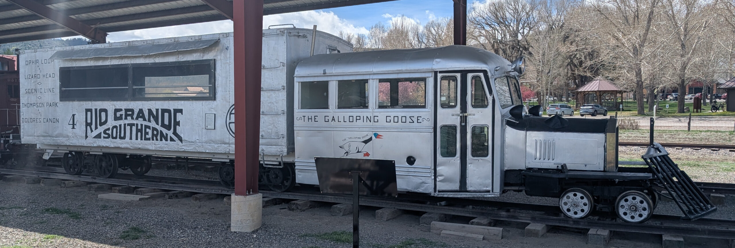 South down US-550 to Ridgeway, where I stopped to admire a Galloping Goose. The story goes that in the 1930s, the Denver and Rio Grande Railroad had fallen on hard times: the mines were closed, but they were still carrying mail. The mail revenue was not enough to operate steam trains profitably, so the folks in the shop tried putting an old bus on rail wheels, to haul mail and a handful of passengers on a low budget. This worked out really well, so they built six more of these improvised railcars. They were painted grey and they “galloped” along the tracks, which were probably not in the best shape at that time. Hence the nickname: “galloping geese.”